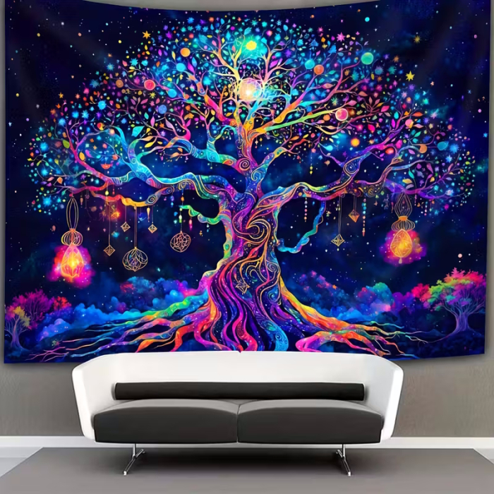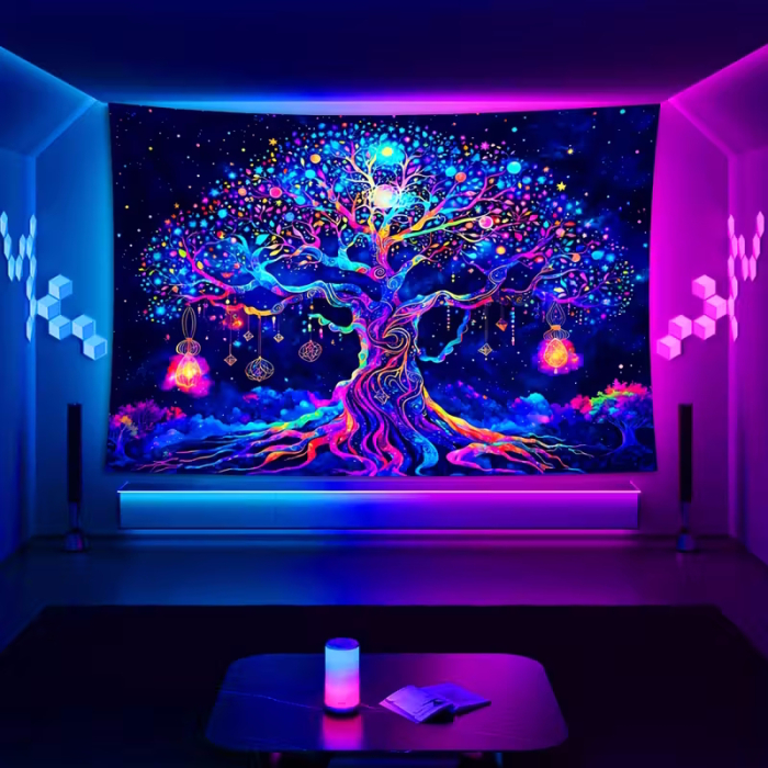 Sie möchten Ihrem Raum sofort mehr Tiefe, Ruhe und gleichzeitig intensive Farbenergie verleihen? Dieses UV-reaktive Wandtuch mit einem kunstvoll gestalteten Lebensbaum entfaltet unter Schwarzlicht seine volle, magische Wirkung und verwandelt jede Wand in ein leuchtendes Highlight.