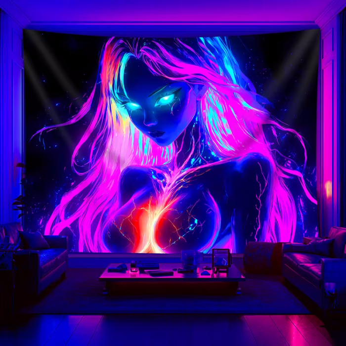Ein UV-reaktives Wandtuch mit künstlerischem Frauenmotiv in leuchtenden Neonfarben – schafft Tiefe, Atmosphäre und einen einzigartigen Schwarzlicht-Look.