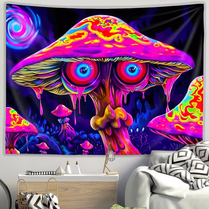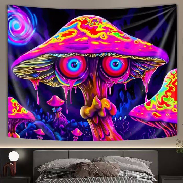 Want to instantly add more color, depth and psychedelic power to your space? This UV reactive wall tapestry featuring a mystical mushroom with glowing eyes is a real eye-catcher and reveals its full hypnotic effect under blacklight.