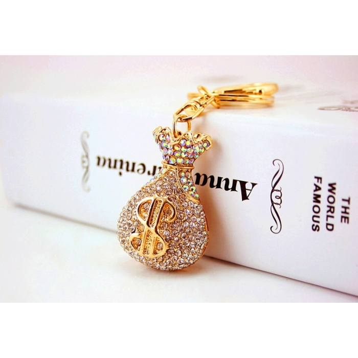 Porte-clés doré en forme de petit sac ludique avec petits strass, mousqueton et anneau. Un accessoire scintillant pour trousseau de clés, sac à main, sac à dos ou comme petite idée cadeau.