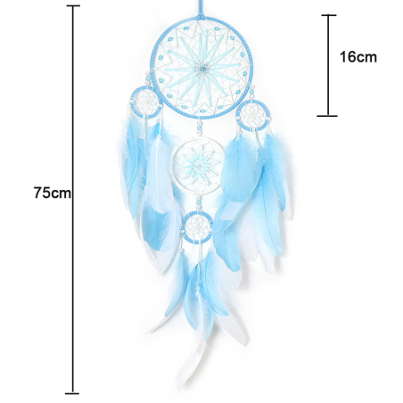 Un attrape-rêves blanc et bleu clair parfaitement coordonné à 5 anneaux, décoré de plusieurs filets étoilés. Quatre anneaux ont un bord bleu et un a un bord blanc. Il est également décoré de plumes blanches et bleu clair.