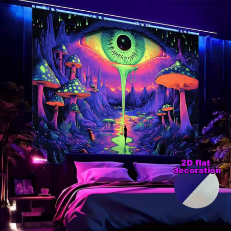 Une tapisserie murale colorée et réactive aux UV avec un grand œil dans un paysage de champignons surréaliste – parfaite pour les soirées lumière noire et les espaces créatifs.