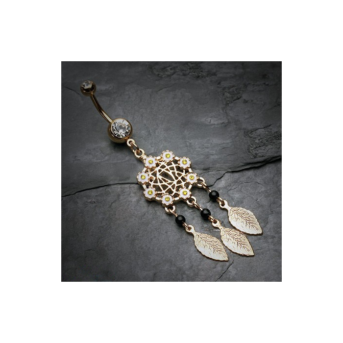 Elegante piercing all'ombelico con acchiappasogni e fiore nero. Decorato con fiori e una sfera di pietra di cristallo. La pallina di apertura più piccola è nera. Questa bigiotteria è realizzata in acciaio inossidabile delicato sulla pelle.