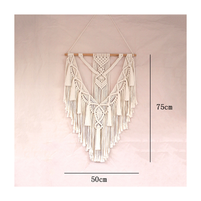 I sottili cordoncini beige, il motivo elaborato annodato a mano e le nappine decorative conferiscono a questo arazzo da parete un aspetto caldo e accogliente. Come decorazione in macramè, si abbina perfettamente ad arredamenti boho, decorazioni naturali, legno, rattan, fiori secchi e altri elementi da parete. In questo modo potrete creare in un attimo un’atmosfera elegante e confortevole con un fascino personale.