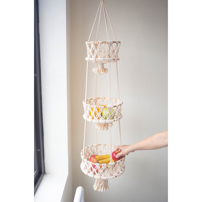 Questo esclusivo cesto di frutta / cesto sospeso in macramè annodato a mano in stile boho con tre cestini di diverse dimensioni realizzati in cotone e anelli di legno. Le corde sono beige. Questi cestini non sono solo belli, ma sono perfetti per conservare frutta, fiori, verdura, ecc. Questo cesto di frutta è veloce da appendere e illuminerà la tua casa in pochissimo tempo con il suo stile semplice e bello.
