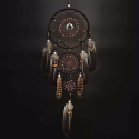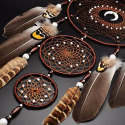 Acchiappasogni Natura marrone scuro medio con 3 cerchi di misure diverse, piume marroni, bordo scuro e perline bianche.