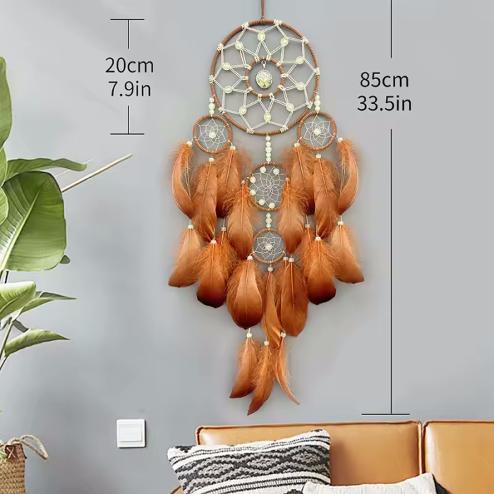 Splendido acchiappasogni marrone chiaro con 5 anelli. Al centro della rete pende un ciondolo Albero della Vita; piccole perline verdi aggiungono delicati accenti.